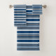 These contemporary bath towels feature a pattern of blue, grey and white stripes.