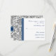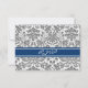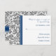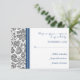 Wedding RSVP cards in elegant and contemporary charcoal grey, dark navy blue, and white classic and chic floral vintage damask pattern. Customizable with your wedding details, available in many matching wedding products.