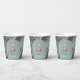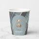 Welcome your little one with timeless charm. This baby shower paper cup features a sweet teddy bear with a blue ribbon. The background showcases a traditional dark grey, with subtle hints of slate blue and green for a fresh, modern touch. Perfect for those who love a sophisticated yet cozy look, this paper cup blends tradition with just the right dash of contemporary flair.