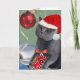 Christmas Cards featuring Grey Cat playing with Christmas Bulbs while wearing Santa hat against backdrop of winter snow.