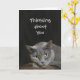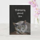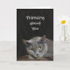 Grey, or blue, cat rests its chin on its paw and announces it's thinking about you, it's always thinking about you cat lovers card that says I care.