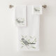 This bird art towel set design is from my original watercolor painting of a Grey Catbird perching on a branch, surrounded by foliage in sage green - set on a customizable solid colour background.