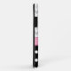 Stylish & sophisticated iPhone 5 case designed with a white polka dots over black pattern on the bottom, a 2-tone grey chevron zigzag pattern on the top, and personalized with your name or custom text in a white script font over a pink stripe.
