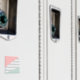 Stylish mint green and coral diagonal corners with a grey chevron centre-