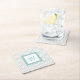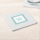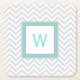 Stylish pulp board paper coasters done in a white and light grey chevron pattern. A aqua, grey and white square, in the middle of the coaster, has a aqua one letter monogram ready to personalize. Great for anytime use and makes a nice gift idea.