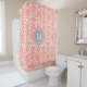 Customizable monogram classic elegant floral damask pattern shower curtain in peach coral pink, dark charcoal grey and white.