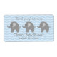 Cute grey elephant baby shower water bottle stickers. Custom babyshower water bottle labels with zoo animal design and chevron pattern background. Personalized elegant DIY waterbottle sticker template. Stylish script typography for name and birth date of baby girl or boy. Use as classy table decoration or thank you for coming party favour for guests. Gender neutral zigzag design with customizable background colour. ie pastel blue, pink, grey or soft yellow. Zig zag stripe print.