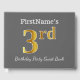 This guest book design features the ordinal number "3rd" with a faux/imitation gold-like appearance. It also features a personalized name, and a grey (grey) coloured background. It could be used at a birthday party for somebody who is celebrating their third birthday. [~Z0000193]