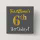 This simple square button design features a message like "FirstName’s 6th Birthday!", with the "6th" having a faux/imitation gold-like colouring look, on a grey (grey) coloured background. The name can be personalized. Buttons like these could perhaps be worn by guests at a birthday party for somebody who is celebrating their sixth birthday, where the party is being held in a large area with lots of other people present (such as a city park or a theme park). [~Z0000192]