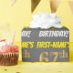 This wrapping paper design features a message like "FIRST-NAME’S 67th BIRTHDAY!", with the "67th" having a faux/imitation gold-like colour appearance, and with the name and "BIRTHDAY" in a fun, bold font. The name can be personalized, and the background is coloured grey (grey). Wrapping paper like this could perhaps be used when wrapping birthday gifts being given to somebody in celebration of their sixty seventh birthday. [~Z0000211]