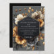 Rich, autumnal blooms in shades of muted gold, deep charcoal, and soft ivory create a sophisticated, romantic atmosphere. This design evokes a sense of cozy elegance, perfect for a fall celebration. The botanical arrangement features a mix of layered petals and wispy foliage.
