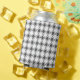 This can cooler has a mid-century modern design of solid grey diamonds inside grey diamond outlines on a field of white.