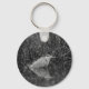 Keychain / keyring with black and white photo of a grey heron with snow falling in winter.