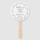 Wedding day program on a round style hand fan that features a light grey colour ivy wreath design on white background, with the bride and groom names and date on front side of fan, along with dark grey, stylized script listing the wedding party participants and ceremony rites on back side of fan. Personalize your hand fan by editing and replacing names and info with your own wedding program info. Perfect for a summer, outdoor wedding venue! Select number of hand fans desired.