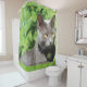 Animal lovers shower curtain with lime green and a grey kitty cat. Stylish and modern home bath decor.