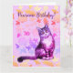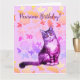 Watercolor painting of a long haired cat, flowers in background, Pawsome Birthday!
