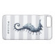 Dress you new phone with this preppy chic striped case featuring a blue illustration of a vintage seahorse in blue over a nautical stripes in light grey.