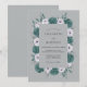 This design features a sophisticated palette of deep teal and pale lavender set against a muted grey background. Lush, ruffled carnations in a dark jewel tone are paired with delicate anemones and soft greenery. Perfect for a winter event, the artwork evokes a sense of moody elegance and timeless romance. The dense botanical arrangement creates a polished and artistic aesthetic.