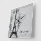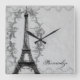 Adorn a wall in any room with this elegant clock design featuring a vintage parisian design featuring the Eiffel Tower against a grunge swirl and postage stamp background in grey. Customizable text allows you to alter fonts, change text colours and sizes as you wish. Personalize for yourself or makes a great gift.