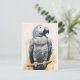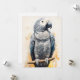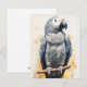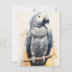A detailed depiction of a parrot perched on a branch showcases its intricate feather patterns and striking eye. Soft hues of grey and blue are accentuated with subtle watercolor splashes in the background.