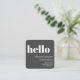 Customizable grey business card, with HELLO typography and name, profession, website and social media details. On the back there is a scannable QR code. To generate a new QR code on the design that links to your own website, click on the "personalize this template" Add your URL address or social media handle in the area provided and a QR code will be generated just for you.