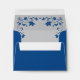 This customizable grey and royal+blue A2 size wedding invitation envelope matches the Royal Blue, Grey Love Hearts Wedding Invitation set and is designed to fit the A2 size RSVP card. This custom A2 envelope has a royal blue background on the outside with an inner grey colour. There are silver look flowers on the front side and royal blue flowers on the inside. Your name and return address is in grey on the centre front of the envelope as it gets mailed back to you.