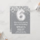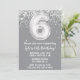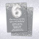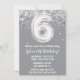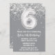 Grey and silver 6th birthday party invitation age 6 birthday party invitation with glitter and modern script writing and fun foil balloons.