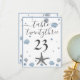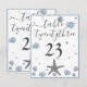 Grey Starfish Blue Shells Beach Wedding Table Number Card. Two hearts in the sand, dark blue background