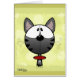 The cute face of a cartoon grey tabby cat is seen with a red collar and yellow background with darker yellow border. Original design by Christie Black of Creations from the Heart.