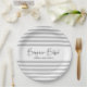 Designed to match the colour of our nursery collection. The design features simple yet modern light grey and white stripes (great for gender-neutral), a header that reads "Bonjour Bebe", meaning hello baby, and one line of text for personalization.