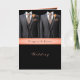 Formal, grey tuxedos with peach floral tie and pretty peach fuzz roses. Pretty peach fuzz, gradient ribbon for your text. Perfect gay wedding invitation for today's happy, modern couple.