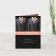 Formal, grey tuxedos with peach floral tie and pretty peach fuzz roses. Pretty peach fuzz, gradient ribbon for your text. Perfect gay wedding invitation for today's happy, modern couple.