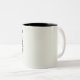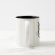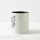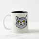 Simple two-tone mug with drawing of a grey tabby cat’s head with whiskers, grey grey silver striped striped hair fur, pink nose, white inside the ears, and golden yellow amber eyes.