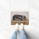 Grey tabby cat sleeping on cardboard box welcome mat. Beautiful cozy cat photograph digitally painted door mat. For cat lovers. Cozy home decor item.