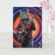 A grey tabby wearing red leather is playing guitar with a gyre background.