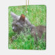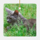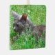 This item displays a photograph of a grey tortie cat resting in the grass.