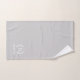 Grey and white trellis patterned bath towel set personalized with your family monogram or other text in a rustic laurel branch. Use the design tools to choose any background colours, edit the text fonts and colours or upload your own photos to create a one of a kind design. The perfect touch for your modern farmhouse bathroom decor!