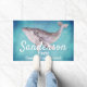Doormat Custom Nautical watercolor Grey Whale on a Coastal Turquoise Blue Background. Personalized with the family name and address.