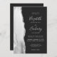The left-hand edge of this elegant modern wedding invitation features a grey and white watercolor agate border trimmed with faux silver glitter. The customizable text combines handwriting, copperplate and italic fonts silver grey on a slate black background. The reverse side provides space for wedding details on a solid slate background, along with a QR code guests can scan to visit your website and RSVP, which saves the cost of printing and mailing separate RSVP cards.