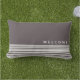 Welcome pillow features a simple grey and white striped design. The top portion features a simple plain grey background with "welcome" presented in stylish modern typography. The bottom portion features a simple modern horizontally striped pattern with light and dark grey stripes with white accents.