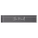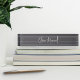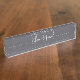 Elegant desk nameplate features your name, title, or choice of personalization in modern white hand scripted cursive lettering on a neutral grey background.