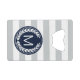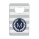 Modern grey and white wide striped pattern with custom laurel wreath logo monogram in navy blue to add your own initial, name or text - personalized credit card bottle openers.