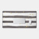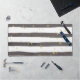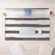 Grey and white striped desk mat with yellow spots.