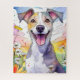A digital art image of a Greyhound dog with a big smile sits among daisy flowers under a vibrant sky filled with colourful splashes. The background features a blend of blue, pink, and yellow hues, creating a joyful and whimsical scene.