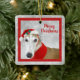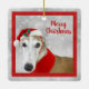 Greyhound Christmas -A red fawn and white greyhound dressed up in a red Santa hat and red collar set on a silver grey bokeh snow background. Framed with a red square frame. Merry Christmas in red script font can be personalized with your message.