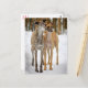 This fun canine postcard features an image of a pair of tan and brindle Greyhound puppy dogs walking in the snow with a woodsy tree background.