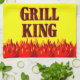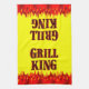 Grill King funny BBQ saying in a western flaming font on a yellow background for cooks and cookout chefs. With graphic art of red and orange flames at the bottom of the design.