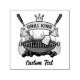 Barbecue grill over flaming charcoal, scroll banner with custom text over fork and spatula. Custom bottom text.
