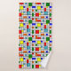 Ce rideau de douche est muni d'un linge bleu clair, d'une serviette bleue à la main et d'une serviette de bain au design Bauhaus d'une grille avec carrés et rectangles en rouge, vert, bleu, orange, bleu clair, jaune et rouge.