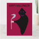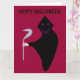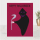This scary Halloween card features an image of the Grim Reaper created using vectors. He stands menacingly holding his scythe in his bony white hand. His sunken purple eyes and demonic grin are only just visible underneath his black cloak.There is a customizable greeting on the front of the card. The inside of the card is blank.